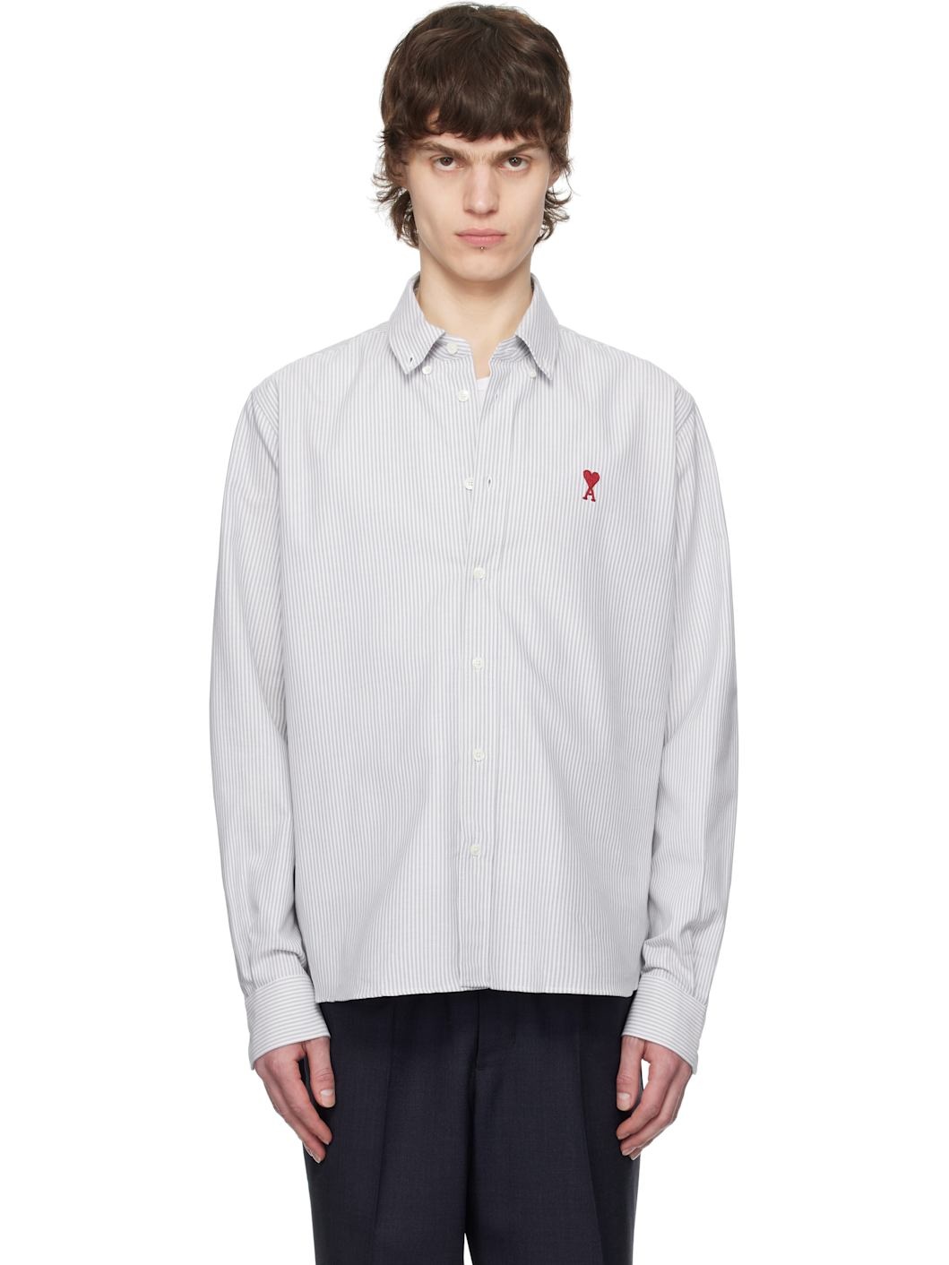 Cotton oxford cloth shirt. Stripes throughout. · Button-down spread collar · Button closure · Embroidered logo at front · Shirttail hem · Pleated single-button barrel cuffs · Mother-of-pearl hardware Supplier color: Note bleue/Blanc 100% cotton. Made in Poland 251482M192004