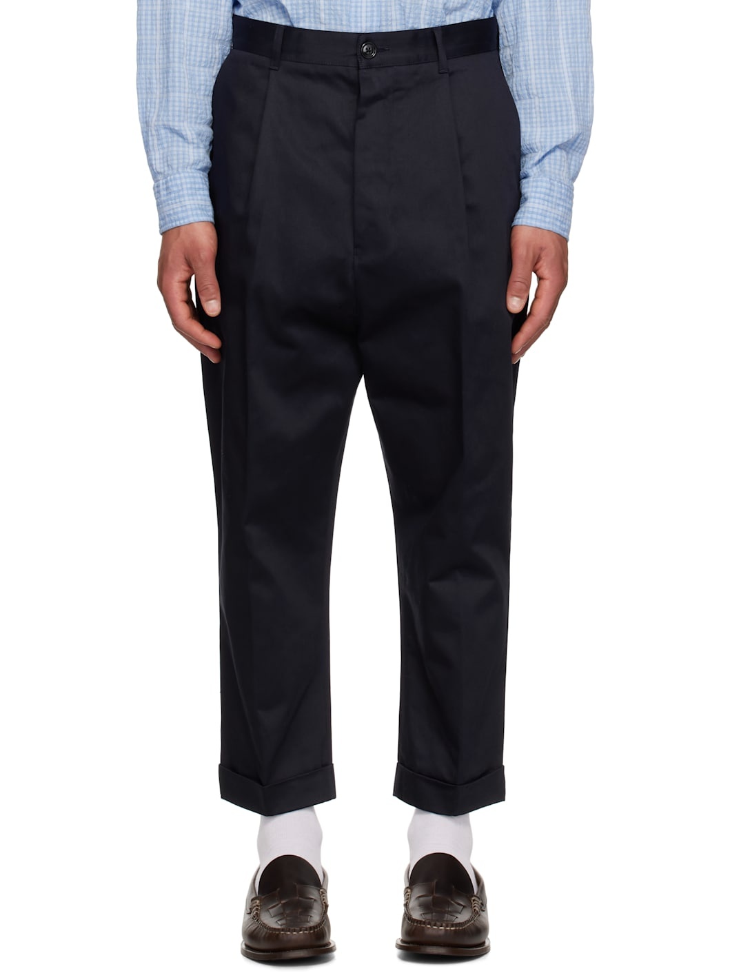 Tapered cotton satin trousers. · Belt loops · Four-pocket styling · Zip-fly · Pleats at front · Creased legs · Rolled cuffs · Logo patch at back waistband · Horn hardware Supplier color: Navy blue 100% cotton. Made in Portugal 251482M191008