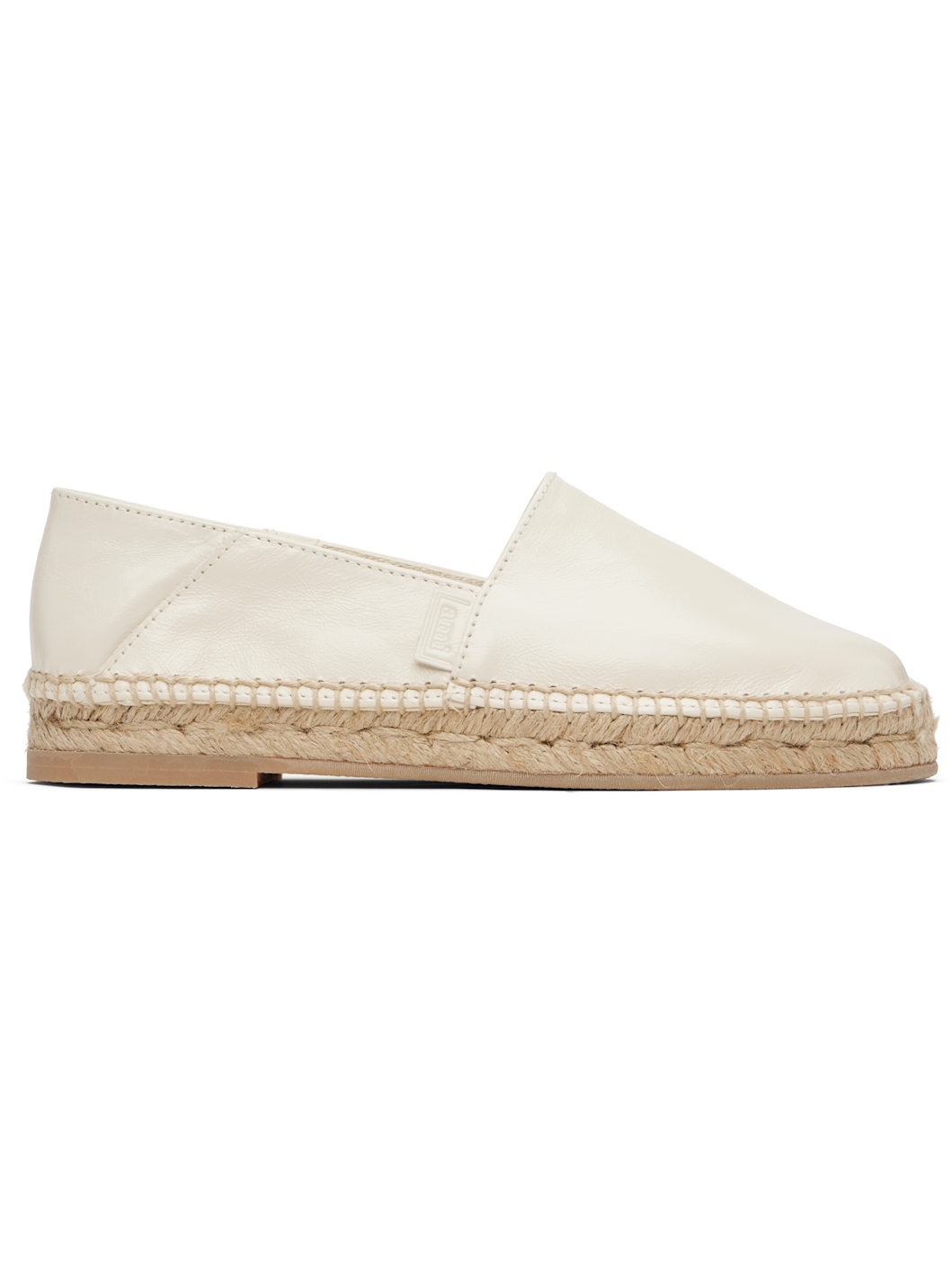 Crackled polished leather espadrilles in off-white. · Logo flag at outer side · Unlined · Blanket stitching at welt · Braided jute midsole · Treaded crepe rubber sole Supplier color: White creme Upper: leather. Sole: hemp, rubber. Made in Spain 251482F119000