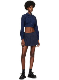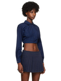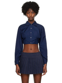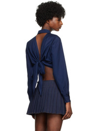 Cotton poplin shirt. · Spread collar · Button closure · Cropped hem · Single-button barrel cuffs · Cutout at back · Self-tie fastening at back Available exclusively at SSENSE. Supplier color: Lazuli blue 100% cotton. Made in Portugal 231482F109034