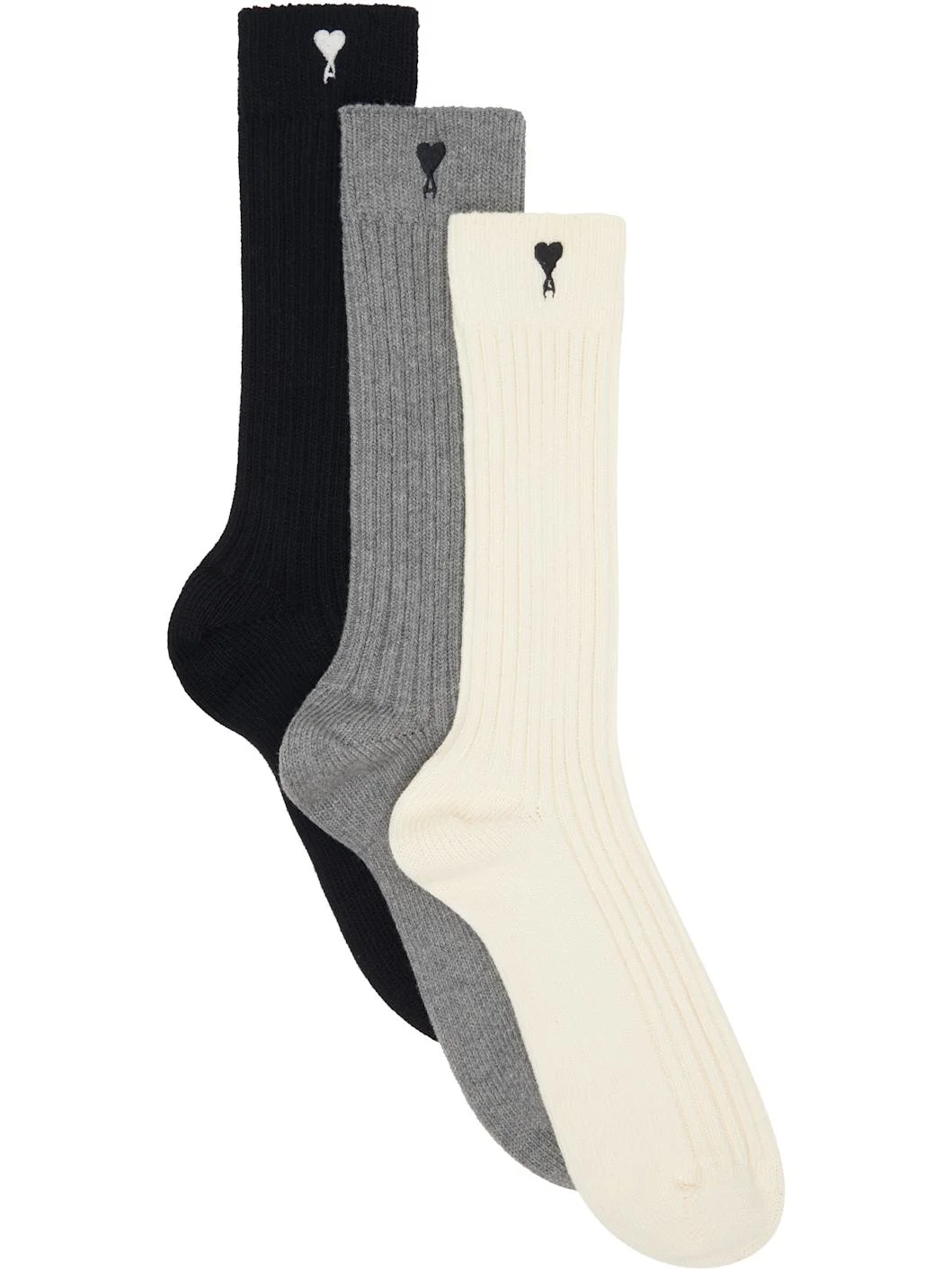 Three pairs of calf-high knit stretch cotton-blend socks in off-white, gray, and black. Logo embroidered at rib-knit cuffs. Supplier color: Ecru/Gris/Noir 86% cotton, 13% polyamide, 1% elastane. Made in Portugal 261482F076000