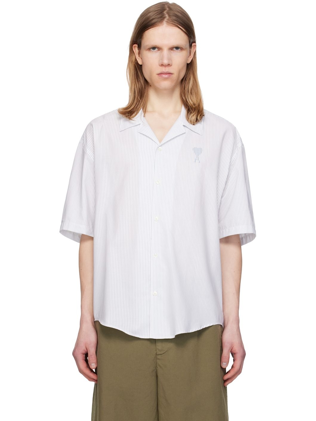 Boxy-fit cotton poplin shirt. Stripes throughout. · Spread collar · Button closure · Logo printed at chest · Shirttail hem · Dropped shoulders · Mother-of-pearl hardware Supplier color: White/Blue note 100% cotton. Made in Poland 251482M192018