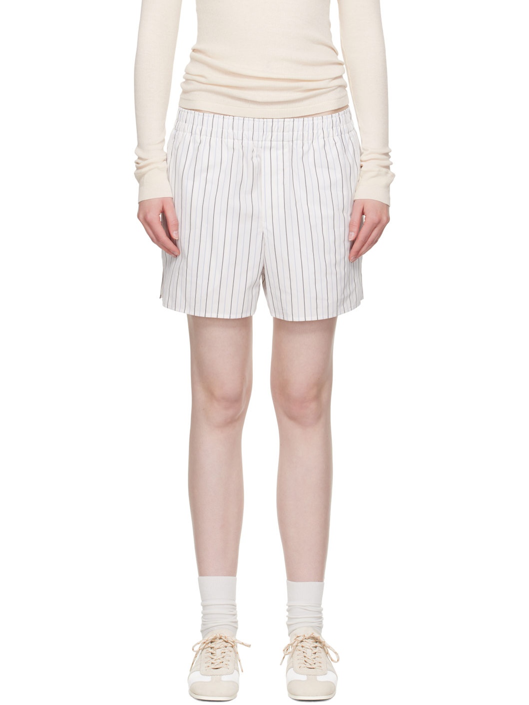 Cotton poplin shorts. Pinstripes throughout. · Elasticized waistband · Three-pocket styling · Mock fly · Vented cuffs · Logo patch at back pocket Supplier color: Offwhite/Blue note/Navy blue 100% cotton. Made in Portugal 251482F088002