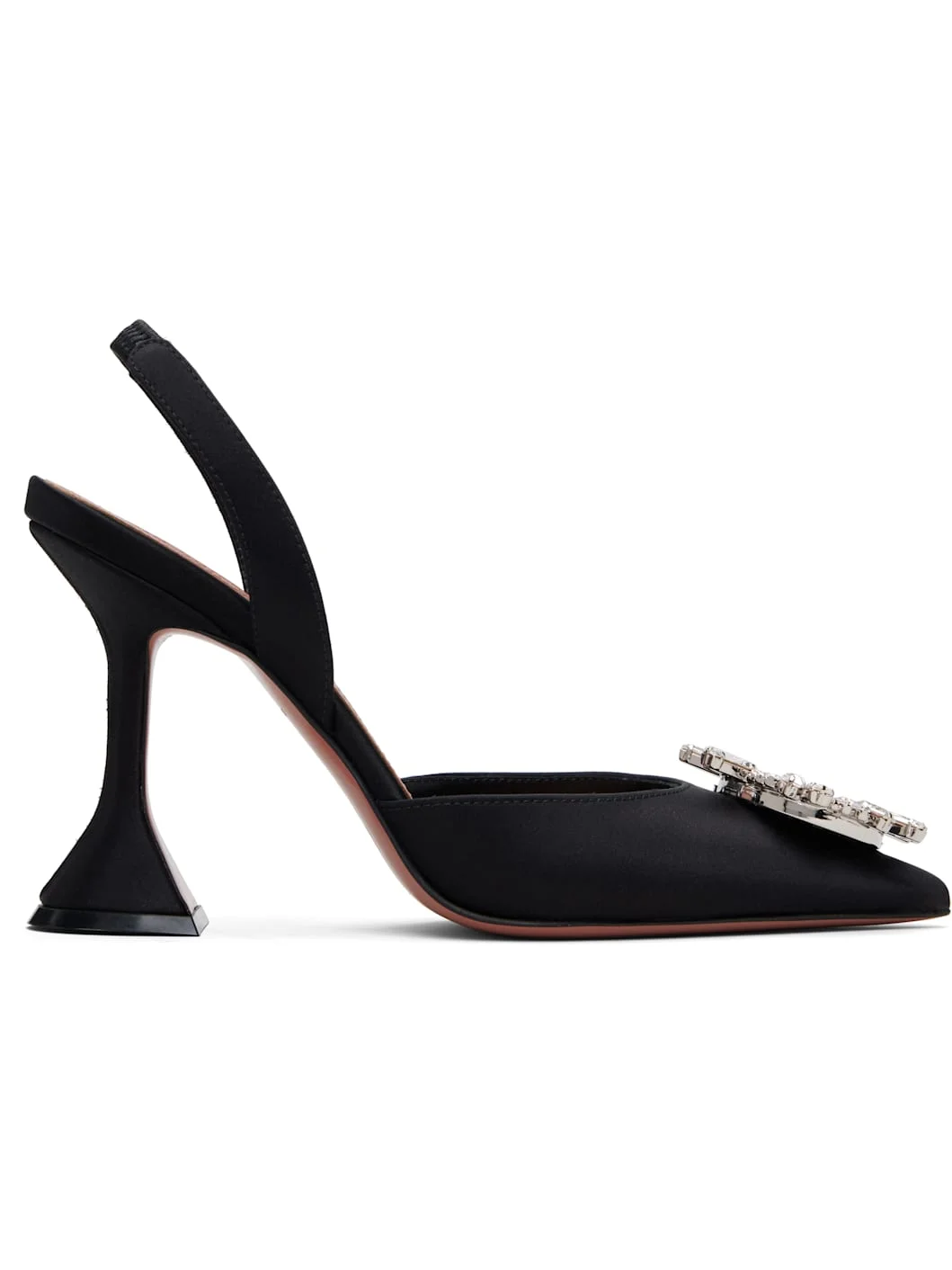 Satin heels. · Pointed toe · Crystal-cut applique at vamp · Partially elasticized slingback strap · Logo embossed at footbed · Spool heel with rubber injection · Polished leather sole with rubber injection · Heel: H3.75" Supplier color: Black Satin Upper: textile, leather. Sole: leather, rubber. Made in Italy 261415F122036