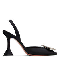 Silk satin heels in black. · Pointed toe · Hardware with crystal-cut accents at vamp · Partially elasticized slingback strap · Logo-embossed leather footbed · Covered spool heel with rubber injection · Polished leather sole with rubber injection · Heel: H3.75" Supplier color: Satin black Upper: textile, leather. Sole: leather, rubber. Made in Italy 252415F122000
