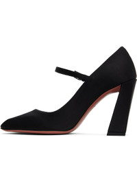 Silk satin heels in black. · Asymmetric square toe · Pin-buckle strap at vamp · Logo-embossed padded goatskin footbed · Covered block heel · Leather sole with rubber injection · Heel: H3.75" Supplier color: Black Upper: textile. Sole: leather, rubber. Made in Italy 242415F122060