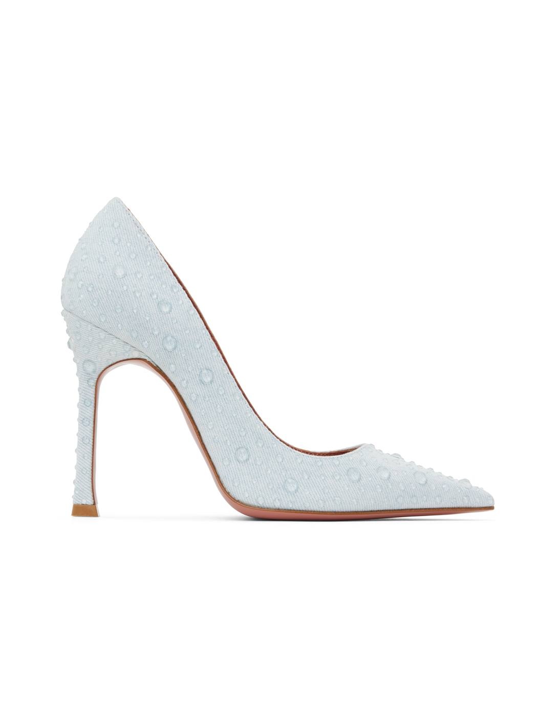 Denim heels in blue. · Transparent appliques throughout · Pointed toe · Logo-embossed grained leather footbed · Covered stiletto heel · Leather sole with rubber injection · Heel: H4" Supplier color: Light denim Upper: textile. Sole: leather, rubber. Made in Italy 242415F122036