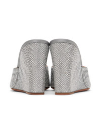 Satin heeled sandals in silver-tone. · Crystal-cut detailing throughout · Square toe · Logo embossed at padded goatskin footbed · Covered wedge heel with rubber injection · Leather sole with rubber injection · Heel: H4" Supplier color: Grey Upper: textile. Sole: leather, rubber. Made in Italy 241415F125020