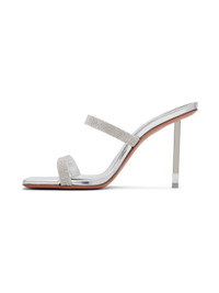 Polished calfskin slip-on heeled sandals in silver-tone. · Open square toe · Crystal-cut straps at vamp · Logo-embossed goatskin footbed · Metal stiletto heel with rubber injection · Leather sole with rubber injection · Heel: H4 in Supplier color: Silver Upper: calfskin, goatskin. Sole: leather, rubber. Made in Italy 232415F125071