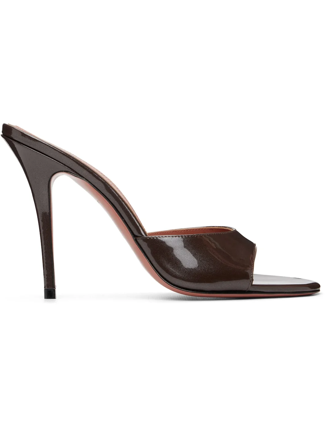 Glittered patent calfskin slip-on heeled sandals. · Open toe · Strap at vamp · Logo embossed at buffed goatskin footbed · Stiletto heel with rubber injection · Polished calfskin sole with rubber injection · Heel: H4" Supplier color: Pearly Coffee Patent Upper: leather. Sole: leather, rubber. Made in Italy 252415F125059