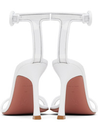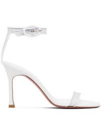 Buffed nappa lambskin heeled sandals in white. · Transparent vinyl trim throughout · Open toe · Pin-buckle ankle strap · Logo-embossed padded footbed · Covered stiletto heel with rubber injection · Leather sole · Heel: H3.75" Supplier color: Nappa white/PVC transparent Upper: lambskin, polyvinyl chloride. Sole: leather, rubber. Made in Italy 252415F125016