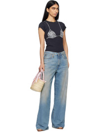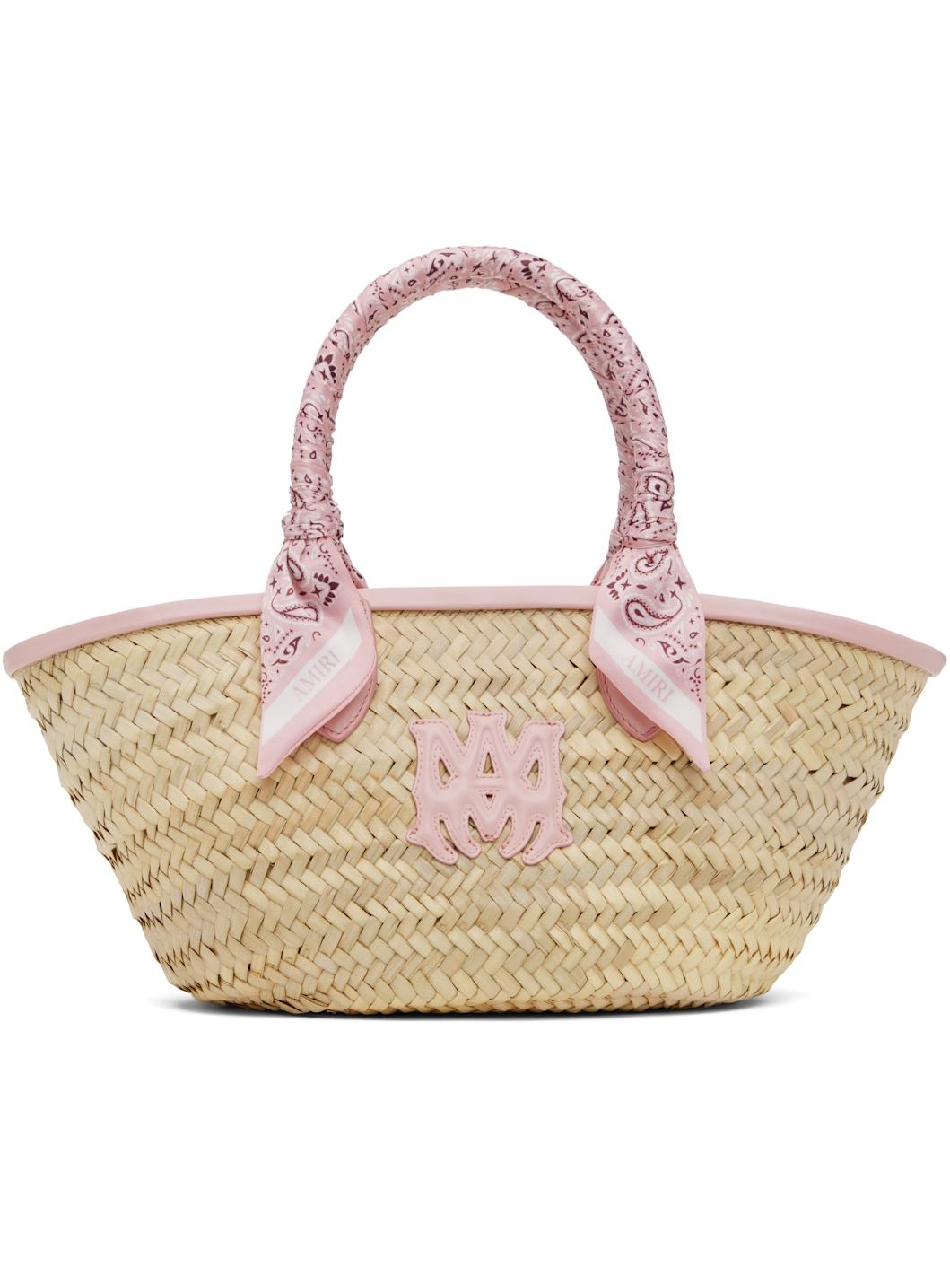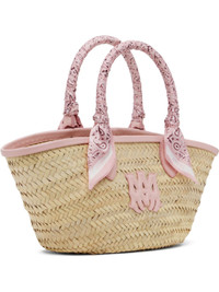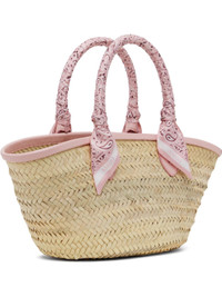 Woven raffia tote in beige. · Buffed leather trim in pink throughout · Bandana-wrapped carry handles · Logo applique at face · Clasp at throat · Unlined · H7.5" x W15" x D5" Supplier color: Dusk pink Textile, leather. Made in Italy 252886F049001