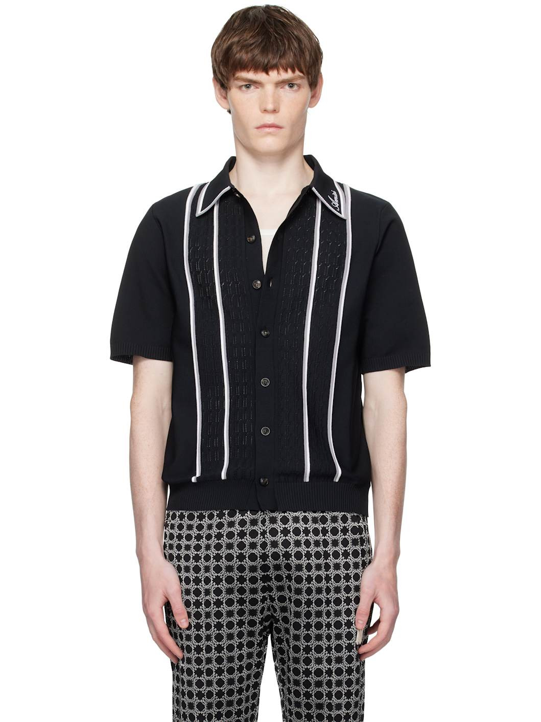 Knit shirt. · Logo embroidered at striped spread collar · Button closure · Stripes and pointelle panels at front · Rib-knit hem and cuffs · Logo hardware at back collar Supplier color: Black 92% polyester, 8% viscose. Made in Italy 252886M192002