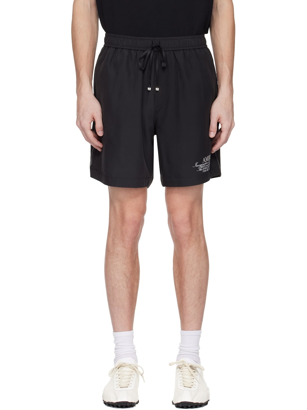 Modal-blend satin shorts. · Drawstring at elasticized waistband · Two-pocket styling · Logo and text printed at front leg Supplier color: Black 60% modal, 40% polyester. Made in Italy 252886M193012
