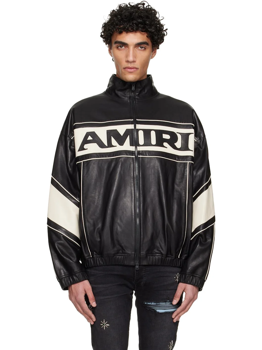 Grained lambskin jacket. · Piping throughout · Paneled construction · Stand collar · Two-way zip closure · Logo patches at front and back · Seam pockets at waist · Elasticized hem and cuffs · Dropped shoulders · Stripe at sleeves · Fully lined Supplier color: Black Body: 100% lambskin. 100% viscose. Made in Turkey 261886M181001