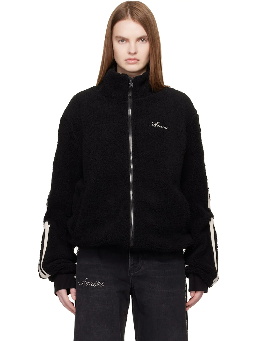 Sherpa fleece jacket. · Stand collar · Zip closure · Logo embroidered at chest · Welt pockets at waist · Bungee-style drawstring at hem · Dropped shoulders · Graphic appliques at sleeves · Rib-knit cuffs · Full viscose twill lining Supplier color: Black Body: 54% acrylic, 46% polyester. Trim: 100% cotton. Lining: 100% viscose. Made in Italy 261886F063001