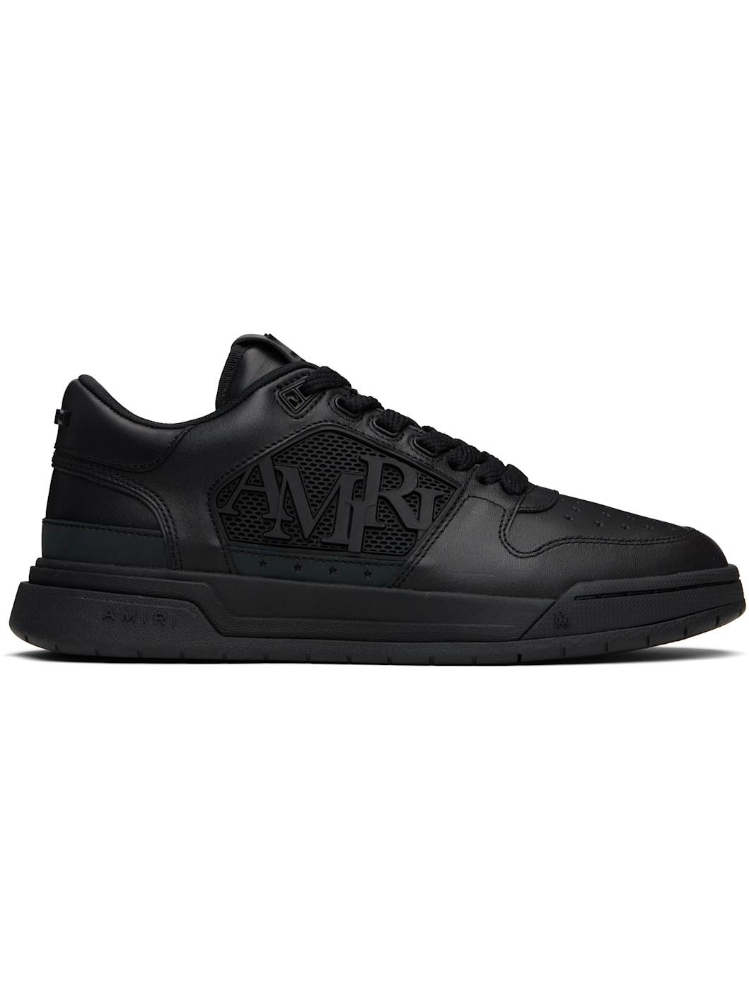 Low-top buffed leather sneakers. · Perforations at toe · Lace-up closure · Logo hardware at tongue and heel tab · Padded tongue and collar · Inset rubberized logo panel at sides · Logos embossed at midsole · Treaded rubber sole Supplier color: Black/Black Upper: leather. Sole: rubber. Made in Viet Nam 252886M237027