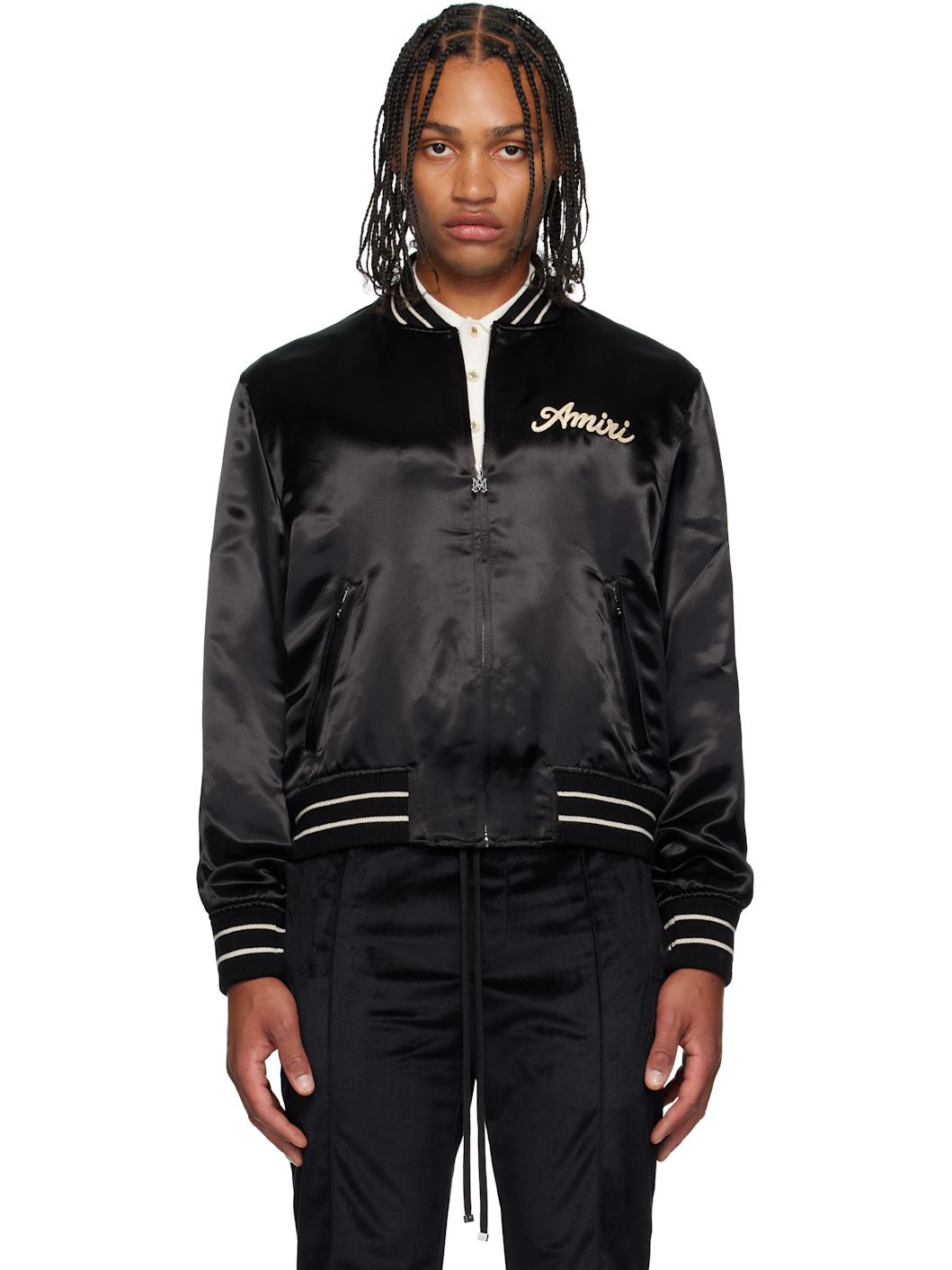 Viscose satin bomber jacket. · Stripes at rib-knit stand collar, hem, and cuffs · Zip closure · Logo appliques at chest and back · Zip pockets at waist · Patch pocket at interior · Full logo-woven satin lining Supplier color: Black Body: 100% viscose. Trim: 98% cotton, 2% elastane. Lining: 100% viscose. Made in Italy 252886M175007
