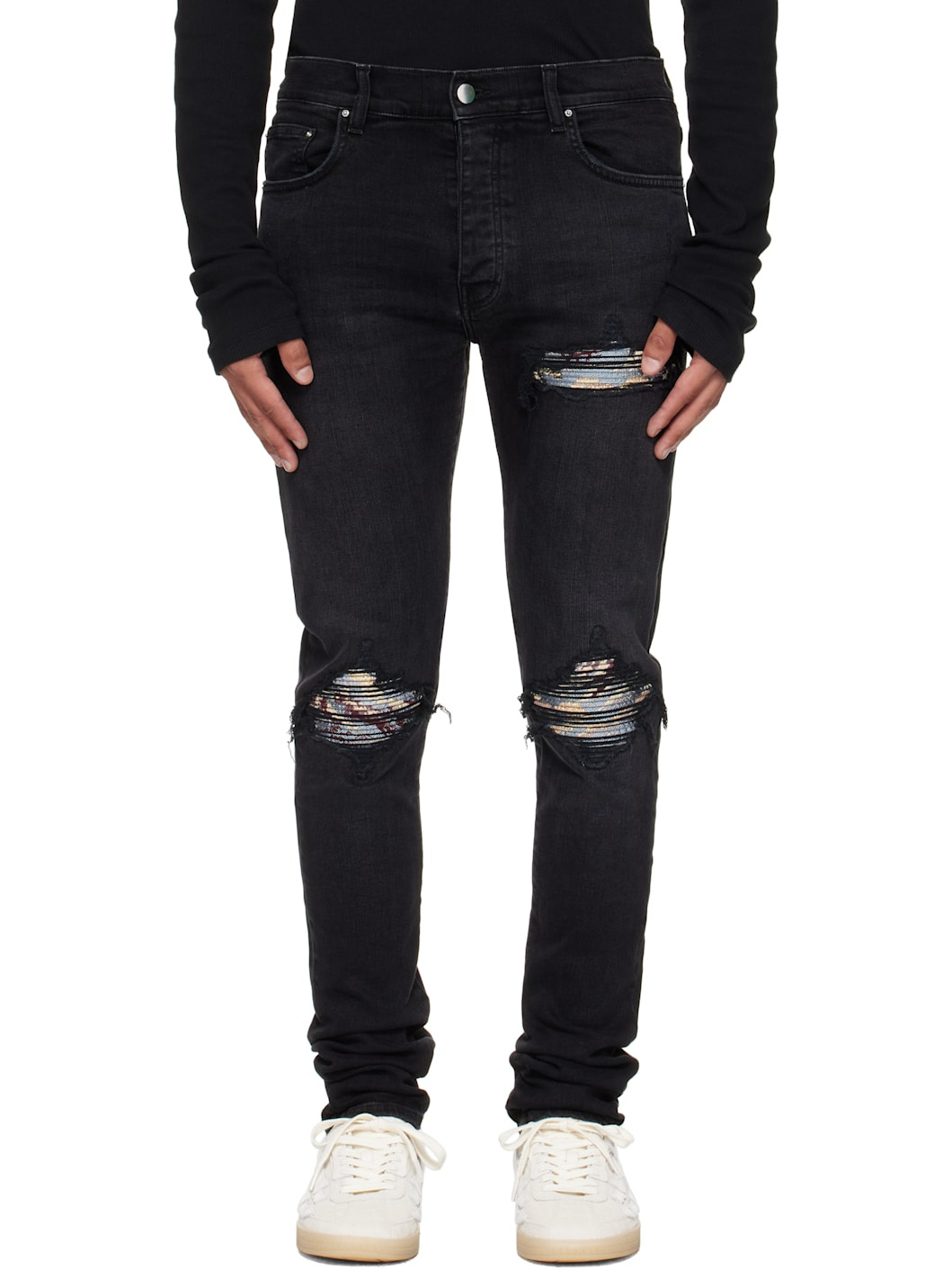 Stretch denim jeans. · Fading, whiskering, and distressing throughout · Belt loops · Five-pocket styling · Button fly · Rips with quilted jacquard underlays at front · Logo patch at back waistband · Jacquard graphic at back pocket · Logo plaque at back pocket Supplier color: Dusk black Trim: 55% polyester, 27% acetate, 12% cotton, 6% feather. Body: 92% cotton, 6% elastomultiester, 2% elastane. Made in United States 252886M186053
