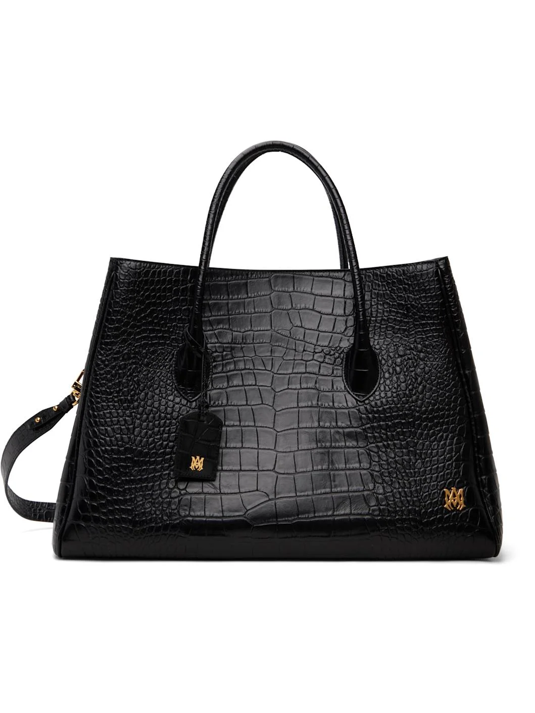 Croc-embossed leather tote. · Twin rolled carry handles · Adjustable and detachable crossbody strap · Detachable luggage tag at handle · Logo hardware at face · Lobster-clasp fastening at open throat · Zip pocket and padded laptop compartment at interior · Twill lining · H13" x W19" x D8.5" Supplier color: Black Leather. Made in Italy 261886M172000