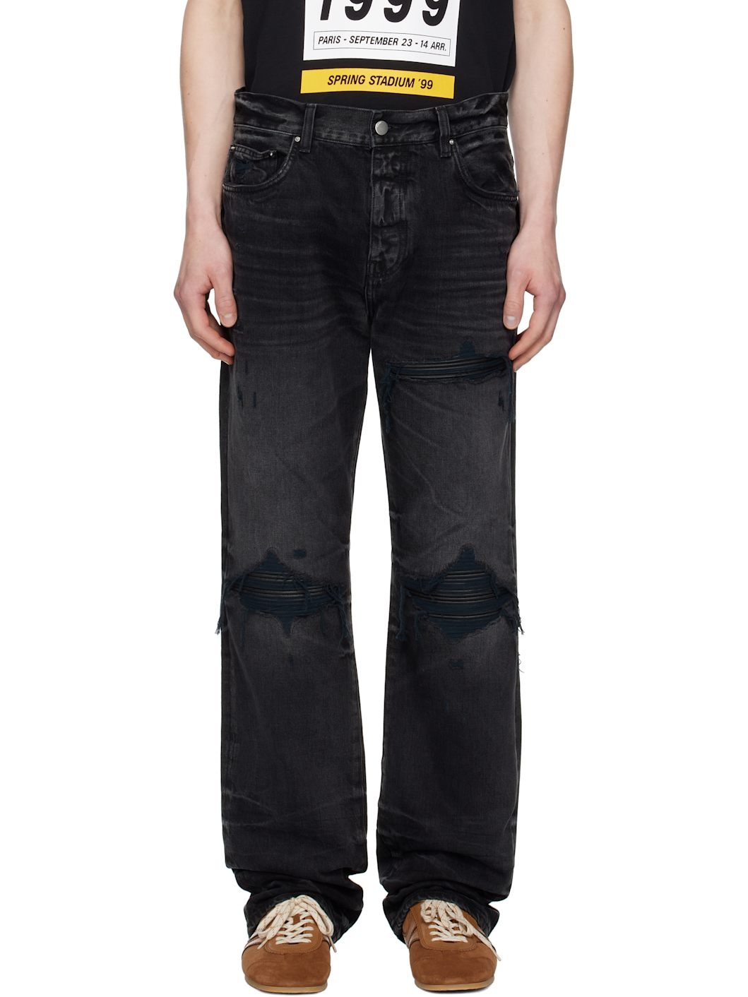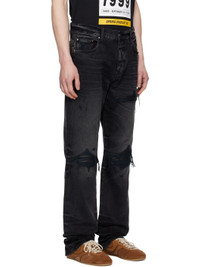 Non-stretch denim jeans. Fading and hand-distressing throughout. · Straight-leg · Belt loops · Five-pocket styling · Button fly · Rips with quilted leather underlay at front · Leather logo patch at back waistband · Logo hardware at back pocket · Silver-tone hardware Supplier color: Vintage black Body: 100% cotton. Trim: 100% leather. Made in United States 252886M186007
