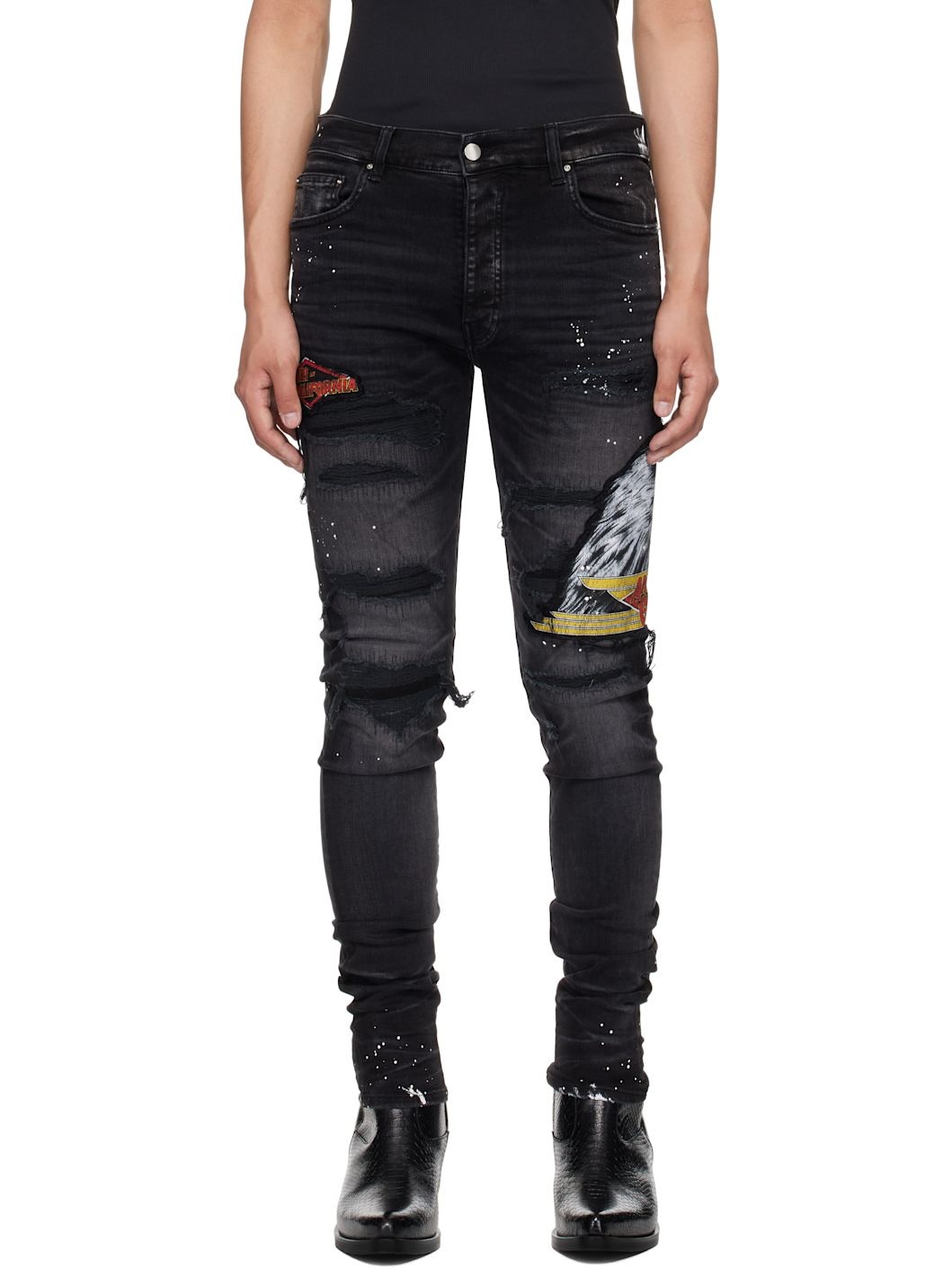 Stretch denim jeans. Fading, distressing, whiskering, and paint splatter throughout. · Belt loops · Five-pocket styling · Button fly · Logo graphic patch at outseams · Logo patch at back waistband · Logo plaque at back pocket Supplier color: Faded black 92% cotton, 6% elastomultiester, 2% elastane. Made in United States 252886M186013