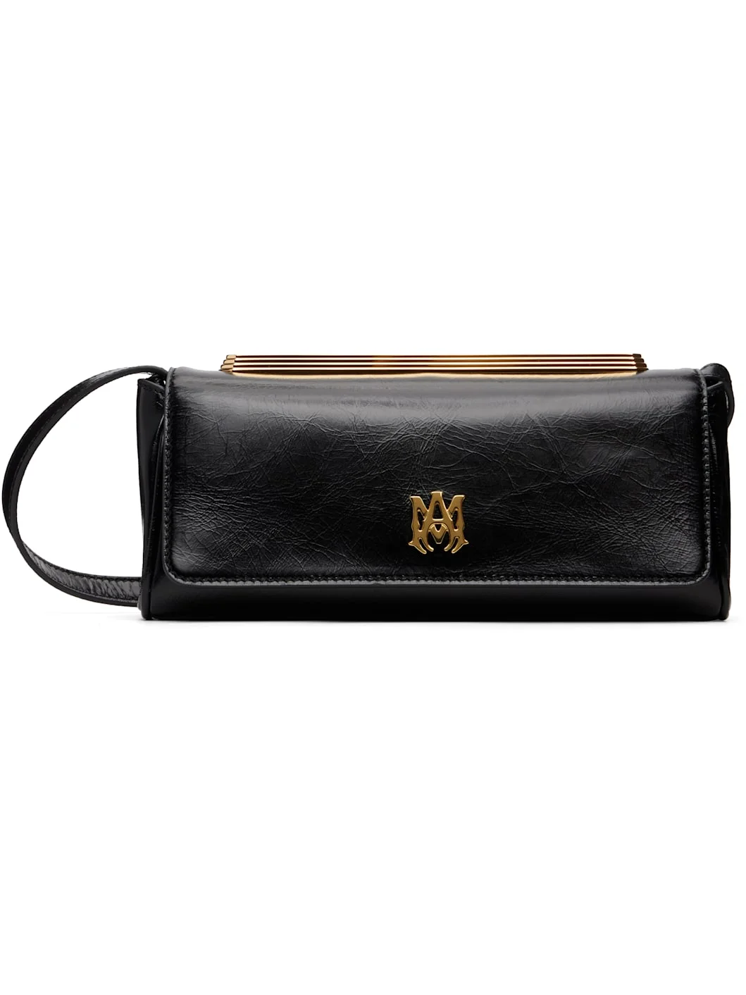 Crackled patent leather clutch. · Logo-engraved and fluted hardware at top · Adjustable and detachable shoulder strap · Logo hardware at face · Magnetic flap closure · Card slot at interior · H4" x W9" x D2.5" Supplier color: Black Leather. Made in Italy 252886F044000