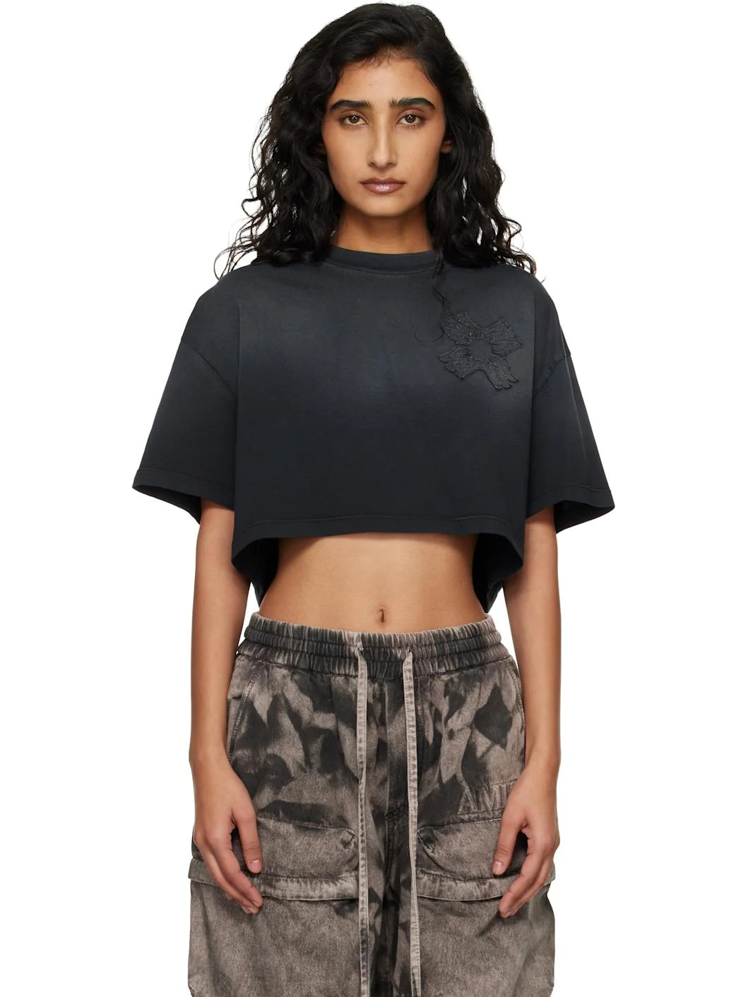 Cotton jersey T-shirt. · Fading throughout · Rib-knit crewneck · Logo applique at chest and back · Cropped hem · Dropped shoulders Supplier color: Black 100% cotton. Made in Italy 261886F110009