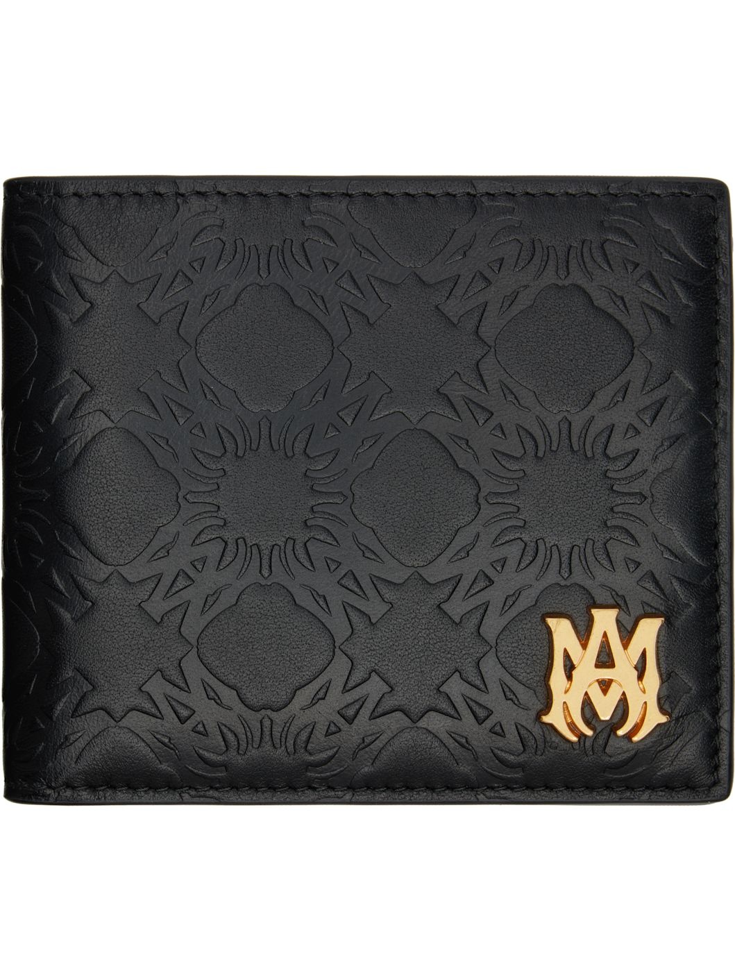 Buffed leather bifold wallet. · Logo graphic pattern embossed throughout · Logo hardware at face · Eight card slots at interior · Two patch pockets and one note slot · Canvas lining · Gold-tone hardware · H3.75" x W4.5" x W0.5" Supplier color: Black Leather. Made in Italy 252886M164003