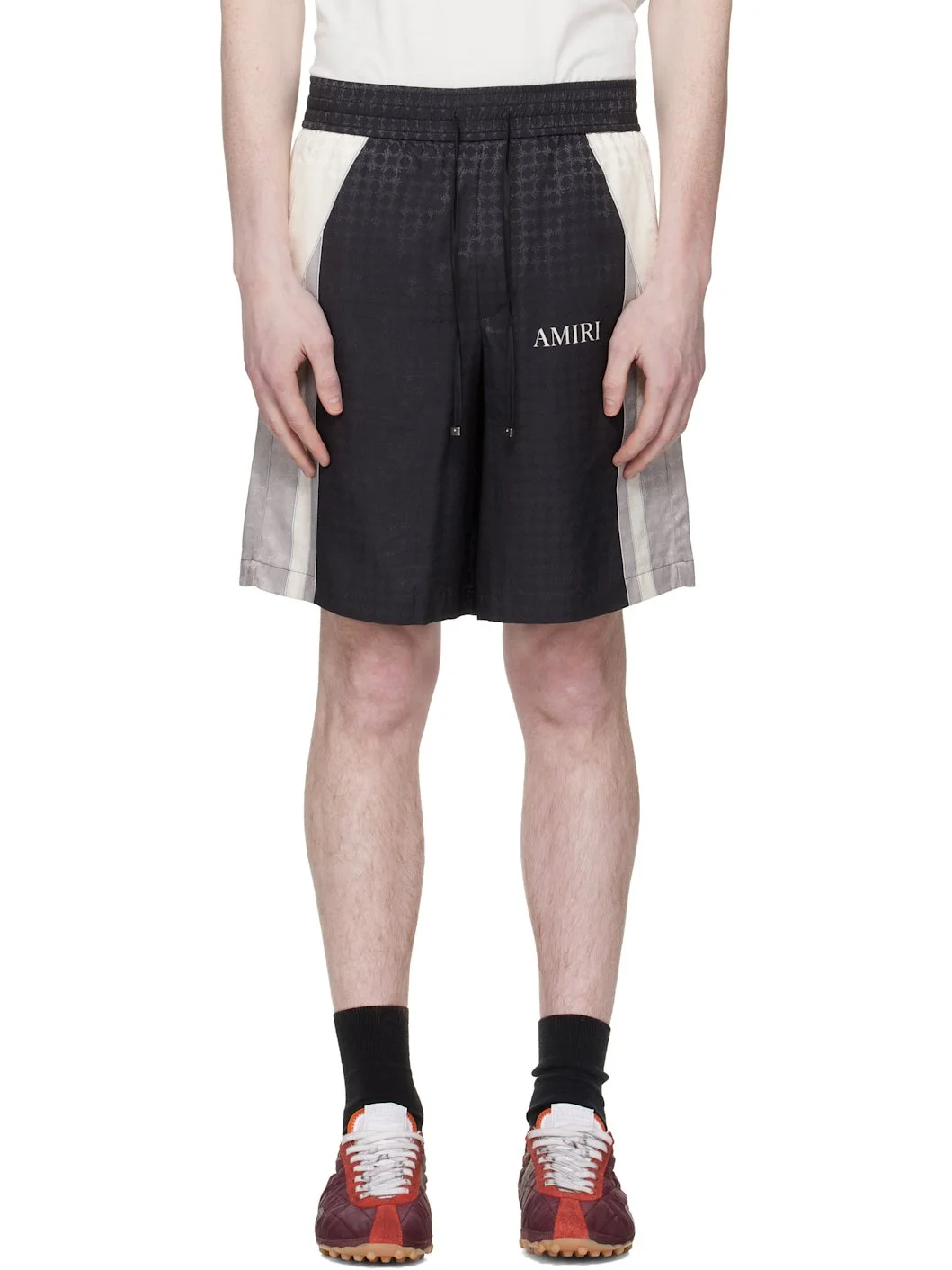 Viscose satin shorts. · Logo pattern throughout · Drawstring at elasticized waistband · Two-pocket styling · Mock fly · Logo printed at front · Stripes at outseams Supplier color: Black 100% viscose. Made in Italy 261886M193006
