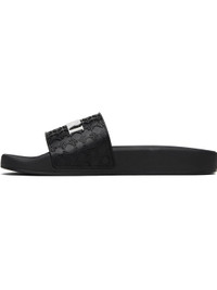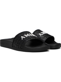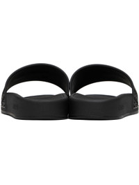 Rubber pool slides. · Logo pattern embossed throughout · Open toe · Logo embossed at vamp and outer side · Molded rubber footbed · Treaded rubber sole Supplier color: Black Rubber. Made in Viet Nam 252886M234000
