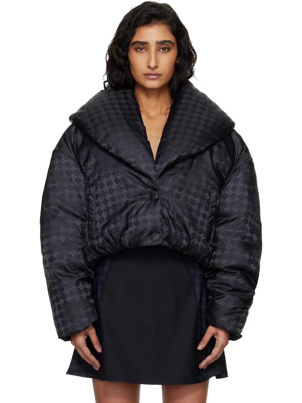Down-filled nylon taffeta jacket. · Jacquard logo graphic throughout · Shawl collar · Press-stud closure · Welt pockets at waist · Elasticized hem and cuffs · Dropped shoulders · Logo bonded at back collar · Quilted taffeta lining Supplier color: Black Fill: 90% duck down, 10% duck feather. Body: 100% polyamide. Lining: 97% polyester, 3% polyurethane. Made in Romania 261886F061007