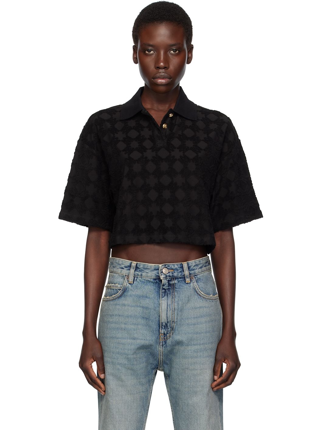 Cotton-blend jersey and terrycloth polo. Jacquard logo pattern throughout. · Rib-knit spread collar · Three-button placket · Cropped hem · Dropped shoulders Supplier color: Black Body: 80% cotton, 20% polyamide. Trim: 100% cotton. Made in Italy 252886F108003