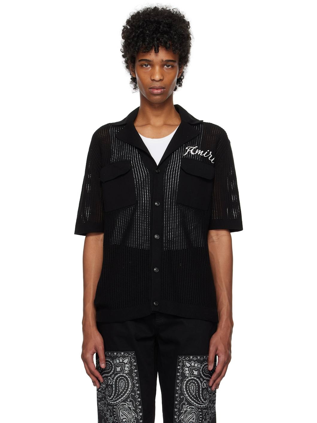 Open-knit cotton shirt. · Rib-knit spread collar, hem, and cuffs · Button closure · Logo embroidered at chest · Flap pockets Supplier color: Black 100% cotton. Made in Italy 251886M192001