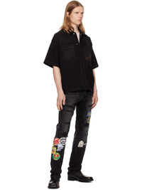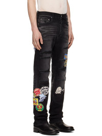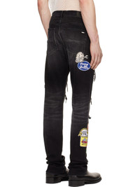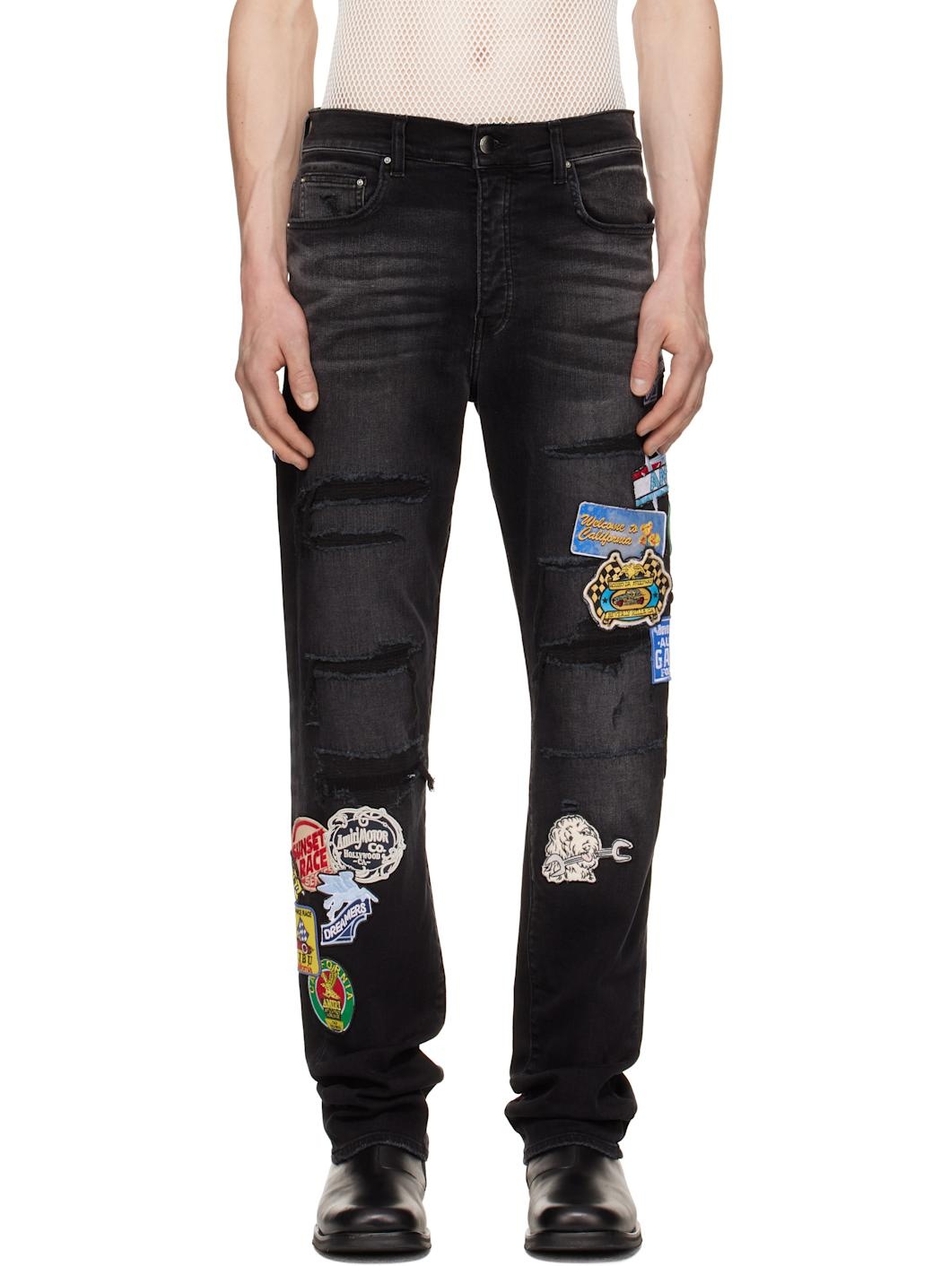 Slim-fit stretch denim jeans. Fading, whiskering, and hand-distressing throughout. · Belt loops · Five-pocket styling · Button fly · Logo graphic patches at legs · Logo patch at back waistband · Logo plaque at back pocket · Contrast stitching in tan Supplier color: Vintage black 92% cotton, 6% elastomultiester, 2% elastane. Made in United States 252886M186008