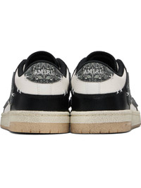 Low-top paneled grained leather and crackled leather sneakers. · Paisley-printed twill trim throughout · Perforations at toe · Lace-up closure · Logo printed at tongue · Padded tongue and collar · Graphic appliques at sides · Logo embroidered at heel tab · Mesh lining · Treaded rubber sole Supplier color: Black Upper: leather, textile. Sole: rubber. Made in Viet Nam 252886M237000