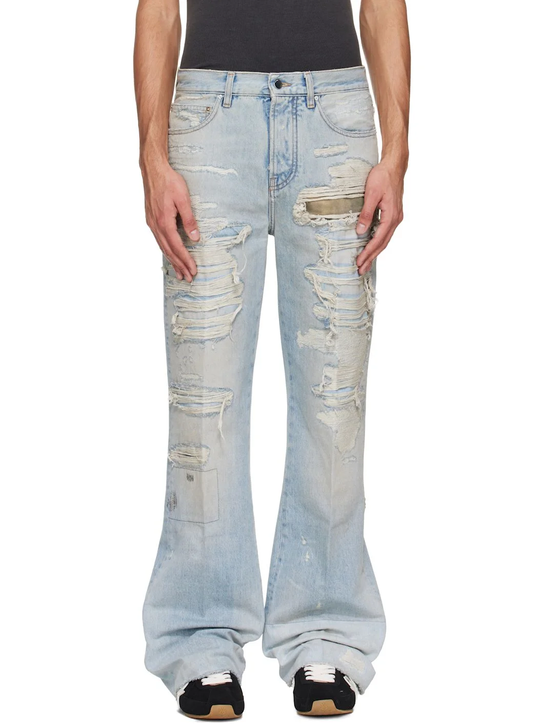 Non-stretch denim jeans. · Fading, whiskering, and distressing throughout · Bootcut · Belt loops · Five-pocket styling · Button fly · Camouflage-printed underlay at rips · Frayed edge at cuffs · Logo patch at back waistband · Logo plaque at back pocket · Logo-engraved silver-tone hardware · Contrast stitching in tan Supplier color: Mist indigo Body: 100% cotton. Trim 1: 100% cotton. Trim 2: 65% polyester, 35% cotton. Made in Italy 261886M186006