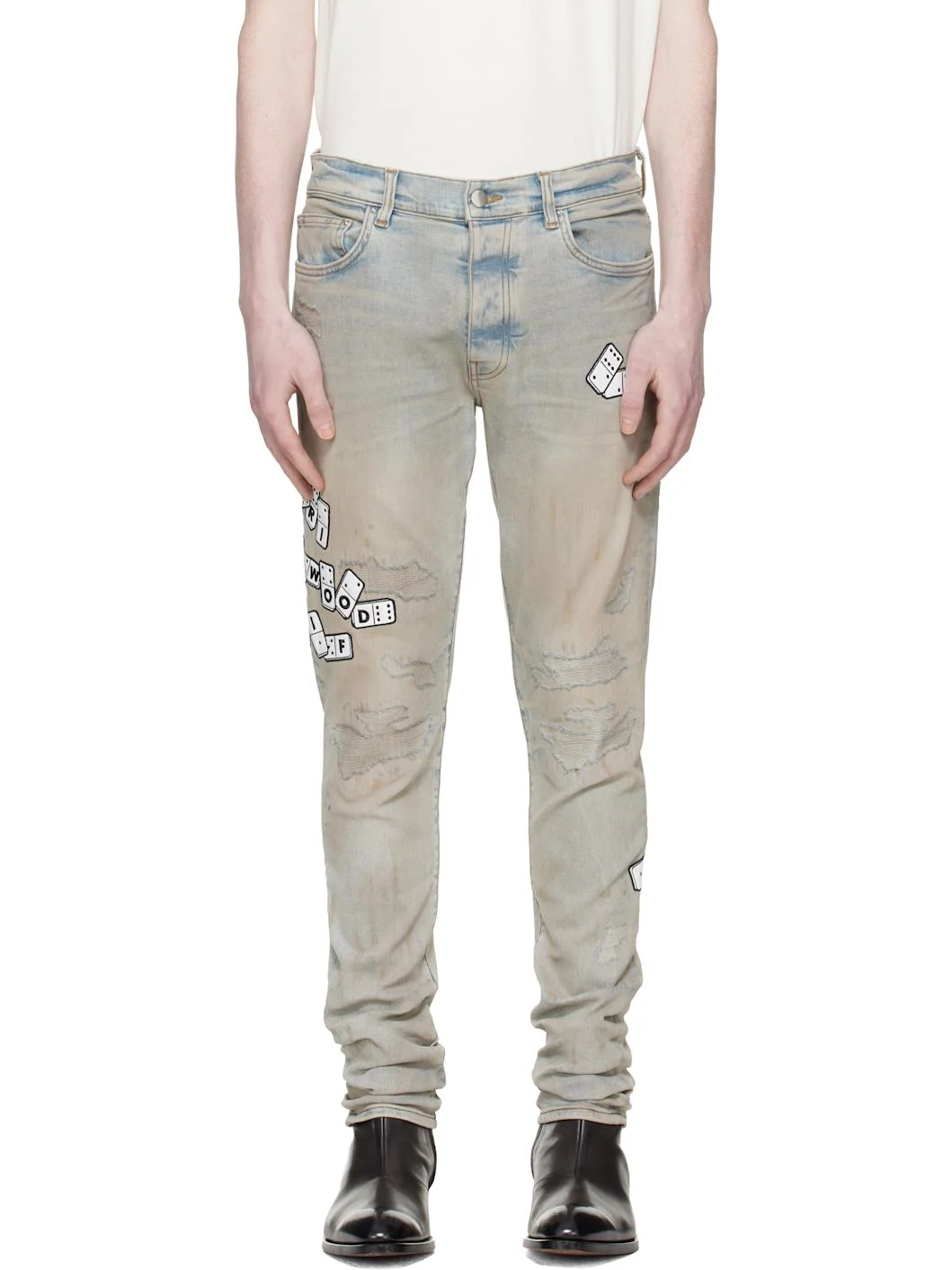 Stretch denim jeans. · Fading and embroidered distressing throughout · Belt loops · Five-pocket styling · Button fly · Grained leather graphic appliques at legs · Embroidered text at back leg · Leather logo patch at back waistband · Logo plaque at back pocket · Contrast stitching in tan · Silver-tone hardware Supplier color: Perfect Antique Indigo 92% cotton, 6% elastomultiester, 2% elastane. Made in United States 261886M186003