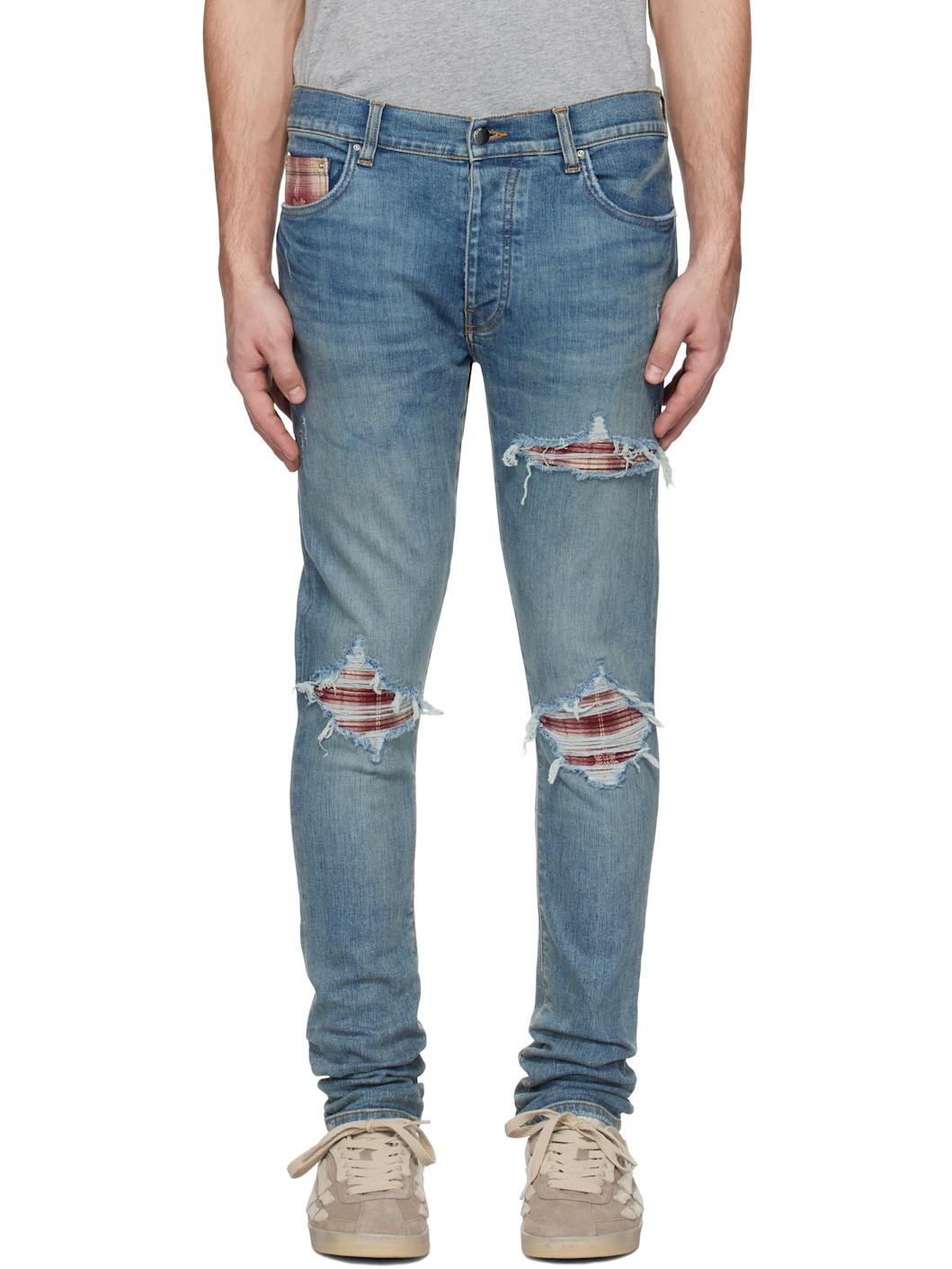 Stretch denim jeans. Fading, whiskering, and distressing throughout. · Logo graphic and check pattern at flannel trim · Belt loops · Five-pocket styling · Button-fly · Quilted flannel underlay at rips · Logo patch at back waistband · Logo plaque at back pocket · Logo-engraved silver-tone hardware · Contrast stitching in tan Supplier color: True indigo 92% cotton, 6% elastomultiester, 2% elastane. Made in United States 251886M186017