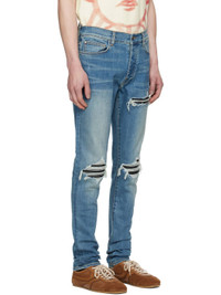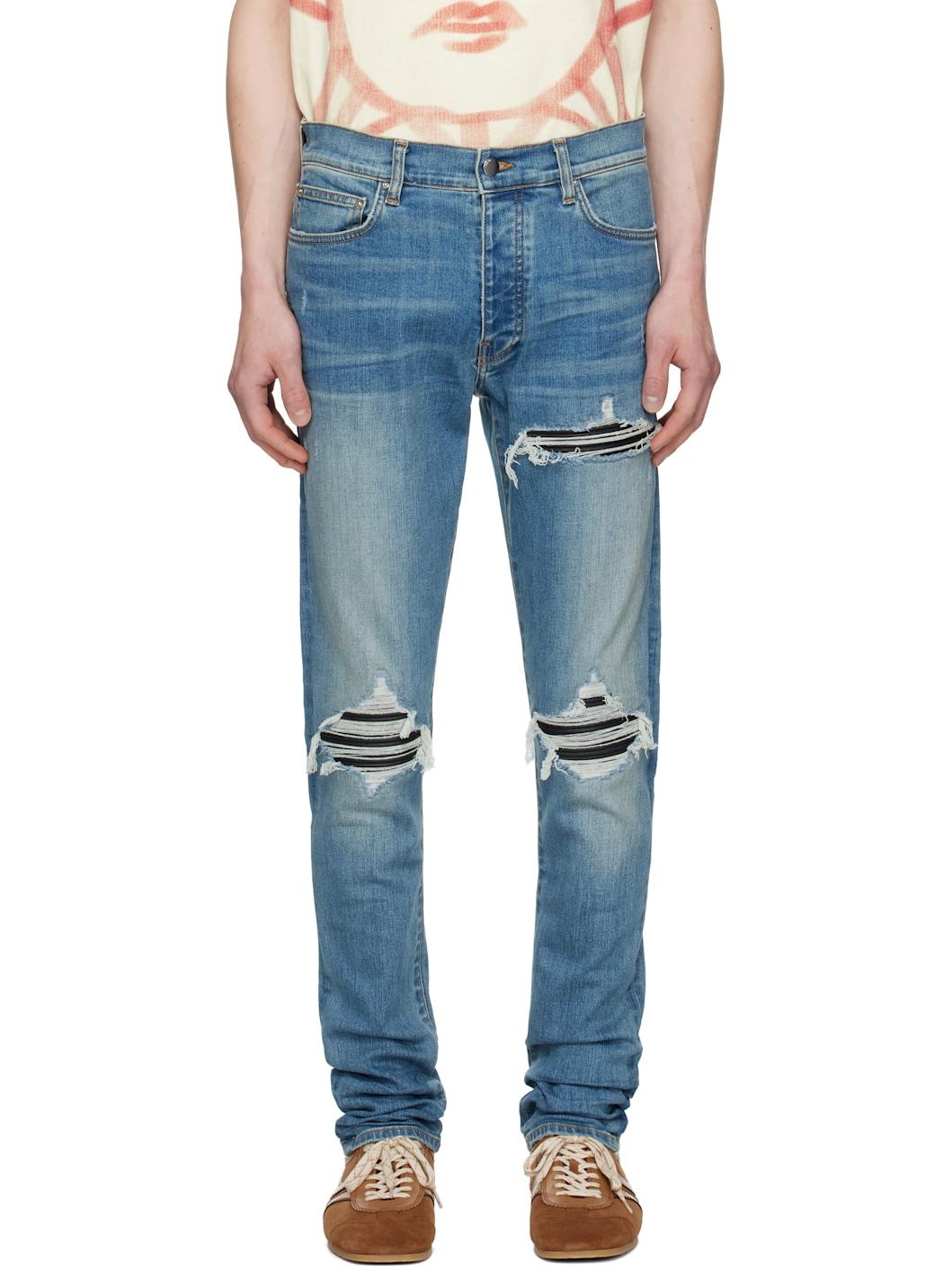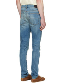 Stretch denim jeans. Fading and distressing throughout. · Skinny-fit · Belt loops · Five-pocket styling · Button fly · Rips with quilted lambskin underlay at front · Leather logo patch at back waistband · Logo hardware at back pocket · Silver-tone hardware · Contrast stitching in tan Supplier color: Dark indigo Body: 92% cotton, 6% elastomultiester, 2% elastane. Trim: 100% lambskin. Made in United States 252886M186037