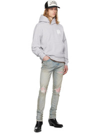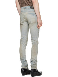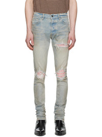 Stretch denim jeans. Fading, smudging, and hand-distressing throughout. · Skinny-fit · Belt loops · Five-pocket styling · Button fly · Rips with paisley-patterned underlay at front · Leather logo patch at back waistband · Logo hardware at back pocket · Silver-tone hardware · Contrast stitching in tan Supplier color: Perfect antique indigo 92% cotton, 6% elastomultiester, 2% elastane. Made in United States 252886M186018