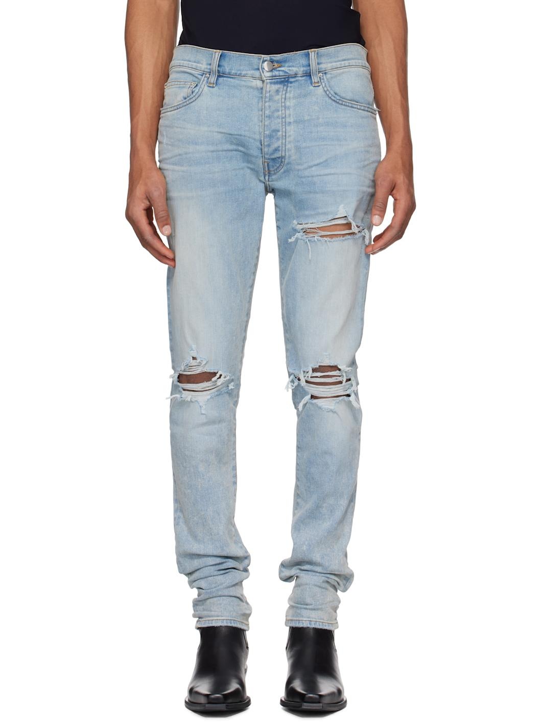 Stretch denim jeans. Fading, whiskering, and distressing throughout. · Belt loops · Five-pocket styling · Button fly · Rips at leg and knees · Leather logo patch at back waistband · Contrast stitching in tan Supplier color: Surf indigo 92% cotton, 6% elastomultiester, 2% elastane. Made in United States 251886M186057