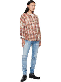 Stretch denim jeans. Fading, hand-distressing, whiskering, and hand-applied paint splatter throughout. · Belt loops · Five-pocket styling · Button fly · Logo patch at back waistband · Logo plaque at back pocket · Contrast stitching in tan Supplier color: Faded indigo 92% cotton, 6% elastomultiester, 2% elastane. Made in United States 252886M186023