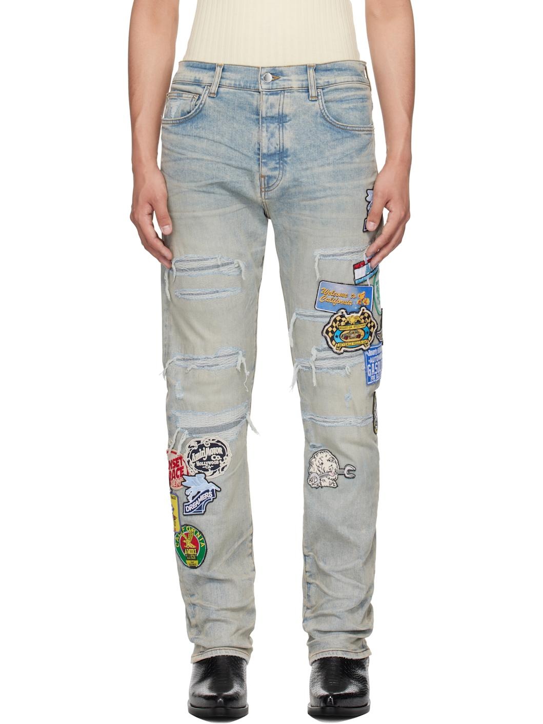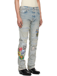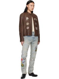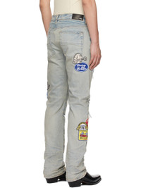 Slim-fit stretch denim jeans. Fading, hand-distressing, whiskering, and logo graphic patches throughout. · Belt loops · Five-pocket styling · Button fly · Logo patch at back waistband · Logo plaque at back pocket · Contrast stitching in tan Supplier color: Perfect antique indigo 92% cotton, 6% elastomultiester, 2% elastane. Made in United States 252886M186009