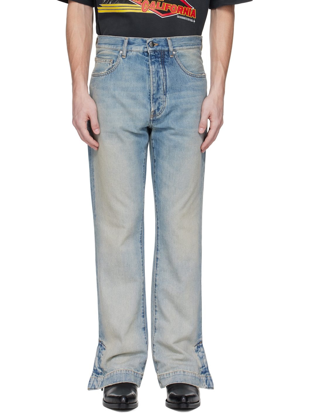 Flared-leg non-stretch denim jeans. Fading, whiskering, and subtle distressing throughout. · Belt loops · Five-pocket styling · Button fly · Press-stud vent at flared cuffs · Suede logo patch at back waistband · Suede patch with logo hardware at back pocket · Logo-engraved silver-tone hardware · Contrast stitching in tan Supplier color: Antique indigo Body: 100% cotton. Lining: 65% polyester, 35% cotton. Made in Italy 252886M186002