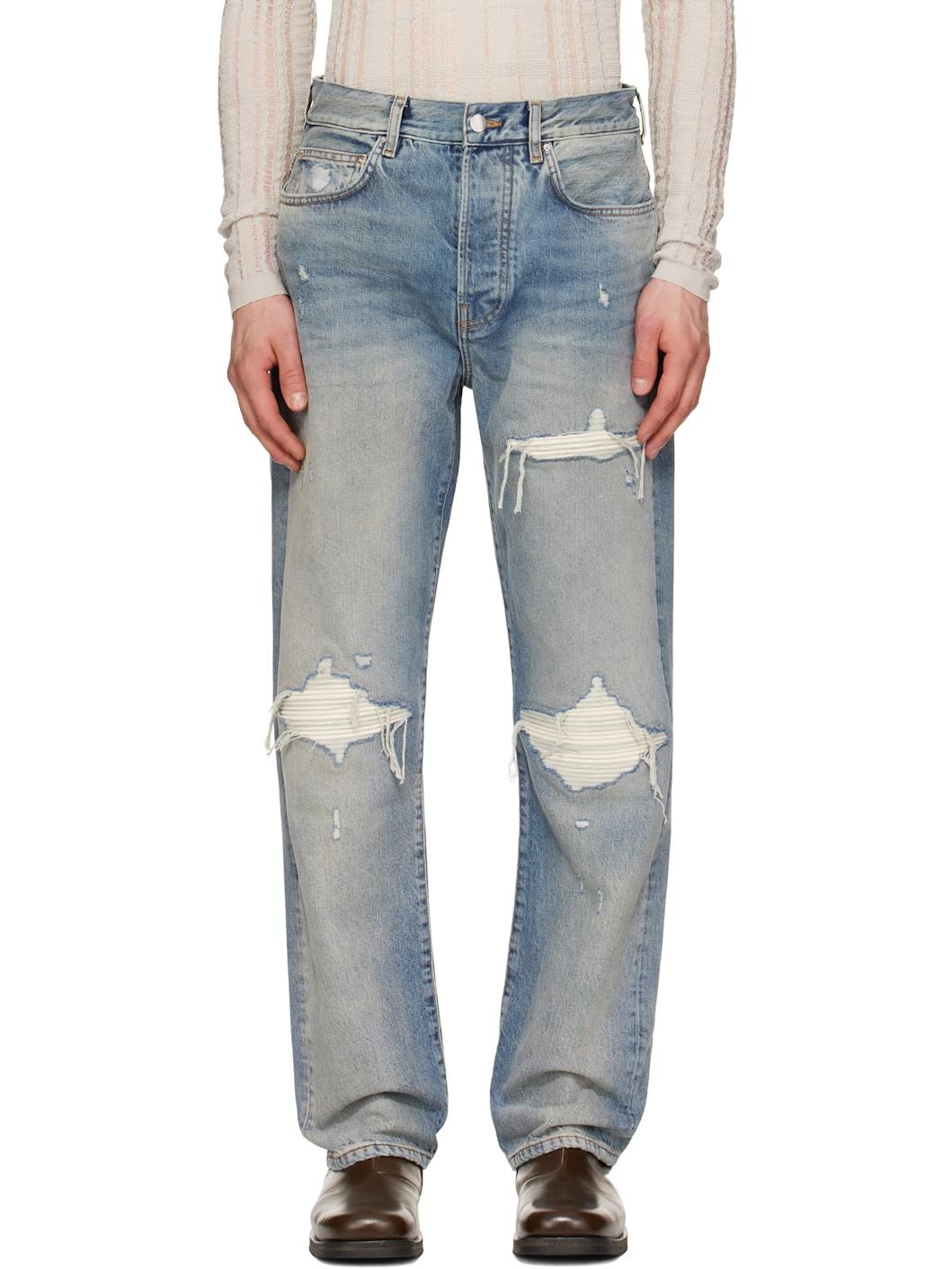 Straight-leg non-stretch denim jeans. Fading, whiskering, and hand-distressing throughout. · Belt loops · Five-pocket styling · Button fly · Quilted faux-suede underlay at rips · Logo patch at back waistband · Logo plaque at back pocket · Contrast stitching in tan Supplier color: Antique indigo Body: 92% cotton, 6% elastomultiester, 2% elastane. Trim: 70% polyester, 30% polyurethane. Made in United States 252886M186001