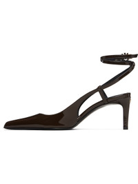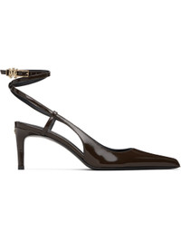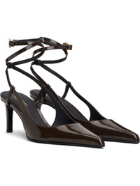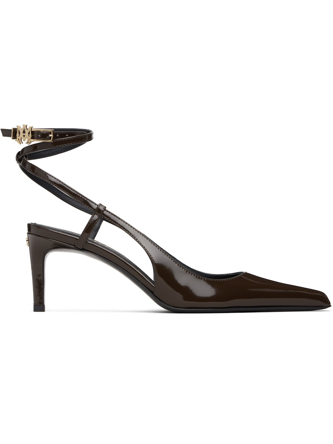 Patent leather heels. · Pointed toe · Wraparound pin-buckle ankle strap with logo hardware · Logo hardware at heel · Stiletto heel with rubber injection · Leather sole · Heel: H3" Supplier color: Chocolate Upper: leather. Sole: leather, rubber. Made in Italy 252886F122000