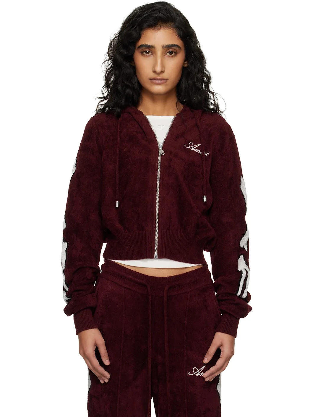 Velour track jacket. · Drawstring at hood · Zip closure · Logo embroidered at chest · Welt pockets at waist · Rib-knit hem and cuffs · Cropped hem · Graphic appliques at sleeves · Silver-tone logo graphic hardware Supplier color: Aged Port 52% viscose, 48% polyamide. Made in Tunisia 261886F097000