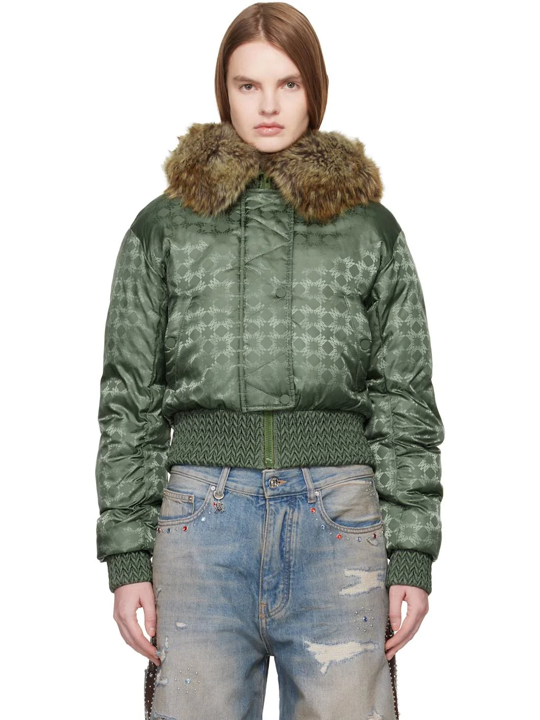 Insulated nylon taffeta jacket. · Jacquard logo pattern throughout · Faux-fur trim and zip fastening at hood · Zip closure with press-stud placket · Welt pockets at waist · Elasticized hem and cuffs · Rubberized logo patch at back collar · Full fleece and taffeta lining Supplier color: Dark sage Body: 100% nylon. Trim: 80% acrylic, 20% polyester. Fill: 100% polyester. Lining 1: 100% polyester. Lining 2: 100% nylon. Made in Italy 261886F061000