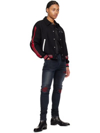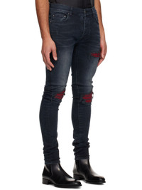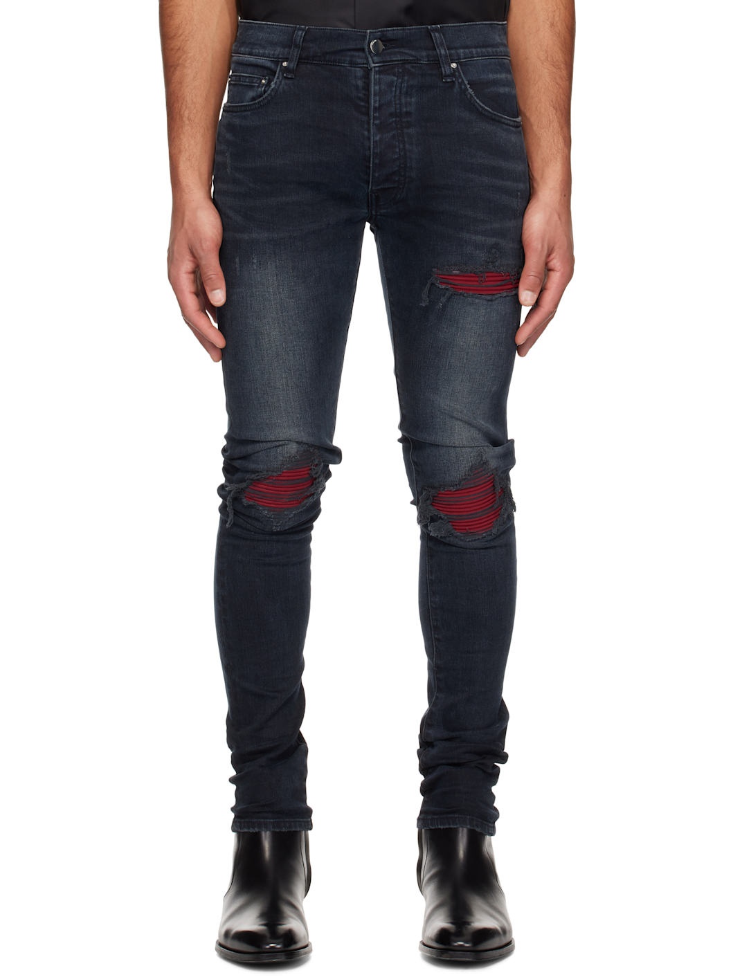 Stretch denim jeans. Fading, whiskering, and hand-distressing throughout. · Belt loops · Five-pocket styling · Button-fly · Rips with quilted faux-suede underlay at front · Leather logo patch at back waistband · Logo plaque at back pocket · Logo-engraved silver-tone hardware Supplier color: Midnight indigo Body: 92% cotton, 6% elastomultiester, 2% elastane. Trim: 70% polyester, 30% polyurethane. Made in United States 251886M186018